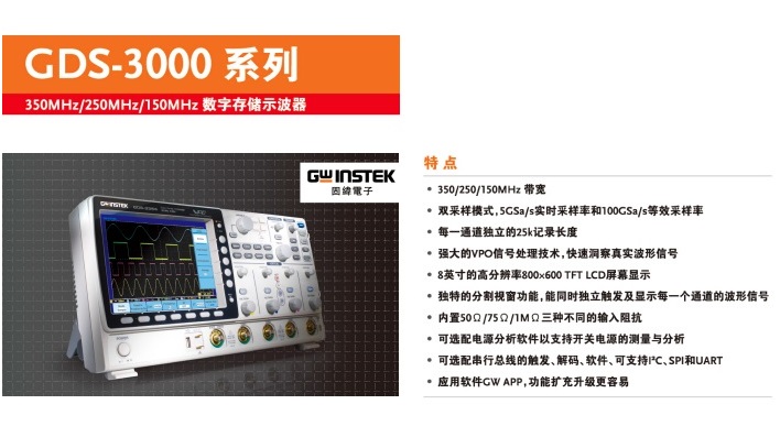 強大的VPO信號處理技術,快速洞察真實波形信號;獨特的分割視窗功能,能同時獨立觸發及顯示每一個通道的波形信號;應用軟件GWAPP,功能擴充升級更容易。