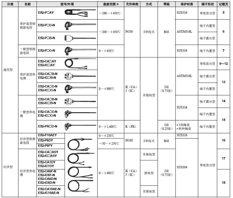 可根據要測量的溫度、場所、周圍環境選擇; 備有種類、形狀、長度及端子部形狀各異的產品;