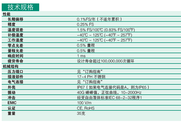 壓力量程0-3.5bar到0-2200bar; 本體直徑19mm,長度25mm(不含壓力及電氣接頭); 濺射薄膜適合OEM用戶; 高可靠性、高穩定性; 多種輸出以及多種壓力電氣連接形式; 結構非常緊湊; 適合安裝空間狹窄的場合.