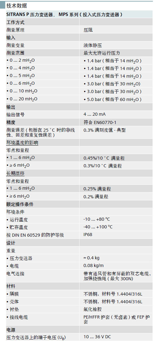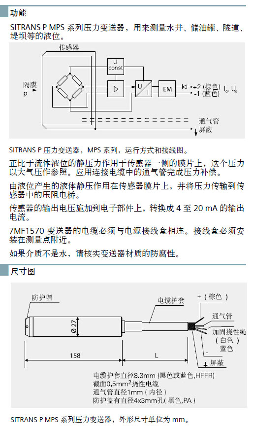 緊湊型設計; 安裝簡單; 很小的測量誤差; 是一款潛水式傳感器用于液體靜壓液位的測量; 適用于測量水井、儲油罐、隧道、堤壩等的液位.