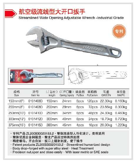 專利產品ZL200930020153.2,整體流線型人性化設計你,美觀適用.整體優質合金鋼鍛造,整支產品經過特殊熱處理,精密螺母,開口自如,扳口鐳射刻度,便于操作.
