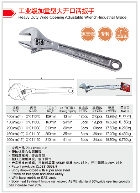 專利產品ZL03313665.8,整體優質合金鋼鍛造,高精度螺母,開合自如,扳口上鐳射刻度,便于操作.整支熱處理,扭矩超美國ASME標準20%以上.