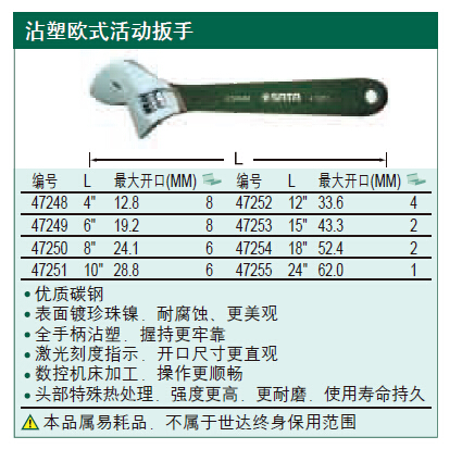 優質碳鋼,表面鍍珍珠鎳,耐腐蝕,更美觀,全手柄沾塑,握持更牢靠,激光刻度指示,開口尺寸更直觀.數控機床加工,操作更順暢.頭部特殊加熱處理,強度更高,更耐磨,使用壽命持久.*本品屬易耗品,不屬于世達終身保用范圍.