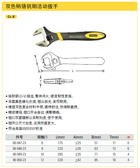 鉻釩鋼(Cr-V),整體淬火,硬度韌性更佳.表面黑色磷化處理,鉗頭拋光,美觀耐用.橡塑雙色復合材料手柄,握持舒適,防滑耐磨損.精密螺母,鉗口開合自如,調整精確.鉗口雙面鐳射供應之刻度,便于使用.鉗開口尺寸加寬,適用范圍更大.符合美國ANSI B107標準.
