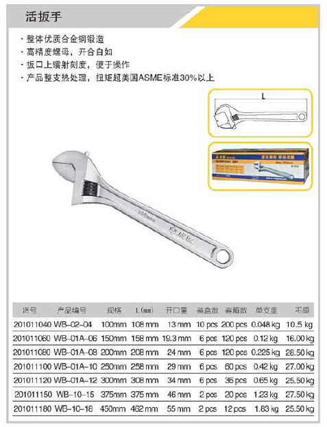 整體優質合金鋼鍛造,高精度螺母,開合自如.扳口上鐳射刻度,便于操作.產品整支熱處理,扭矩超美國ASME標準30%以上.