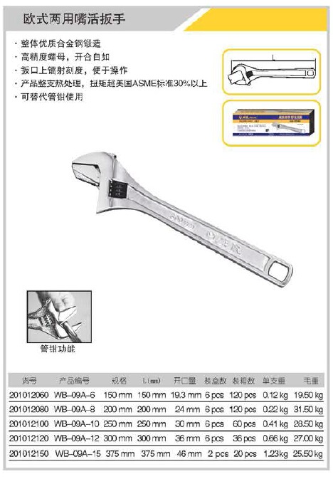 整體優質合金鋼鍛造,高精度螺母,開合自如.扳口上鐳射刻度,便于操作.產品整支熱處理,扭矩超美國ASME標準30%以上.可替代管鉗使用.