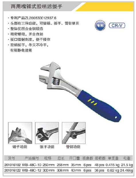 專(zhuān)利產(chǎn)品ZL200830012937.6,頭部有三種功能,可做錘、扳手、管鉗使用,整體優(yōu)質(zhì)合金鋼鍛造,精密螺母,開(kāi)合自如,扳口鐳射刻度,便于操作,膠柄扳手,冬天不冷手,有隔靜電效果.