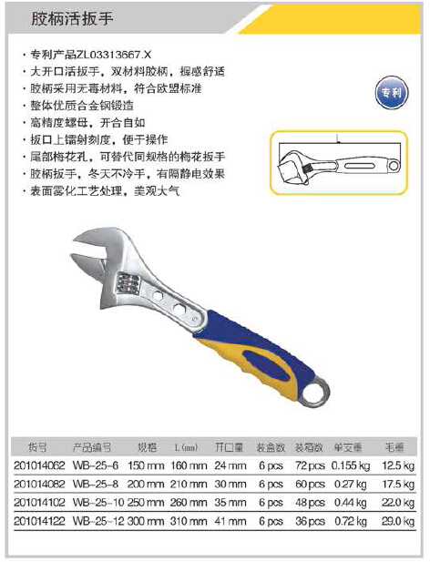 專利產品ZL03313667.X,大開口活扳手,雙材料膠柄,握感舒適,膠柄采用無毒材料,符合歐盟標準,整體優質合金鋼鍛造,高精度螺母,開合自如,扳口上鐳射刻度,便于操作.尾部梅花孔,可替代同規格的梅花扳手,膠柄扳手,冬天不冷手,有隔靜電效果,表面霧化工業處理,美觀大氣.